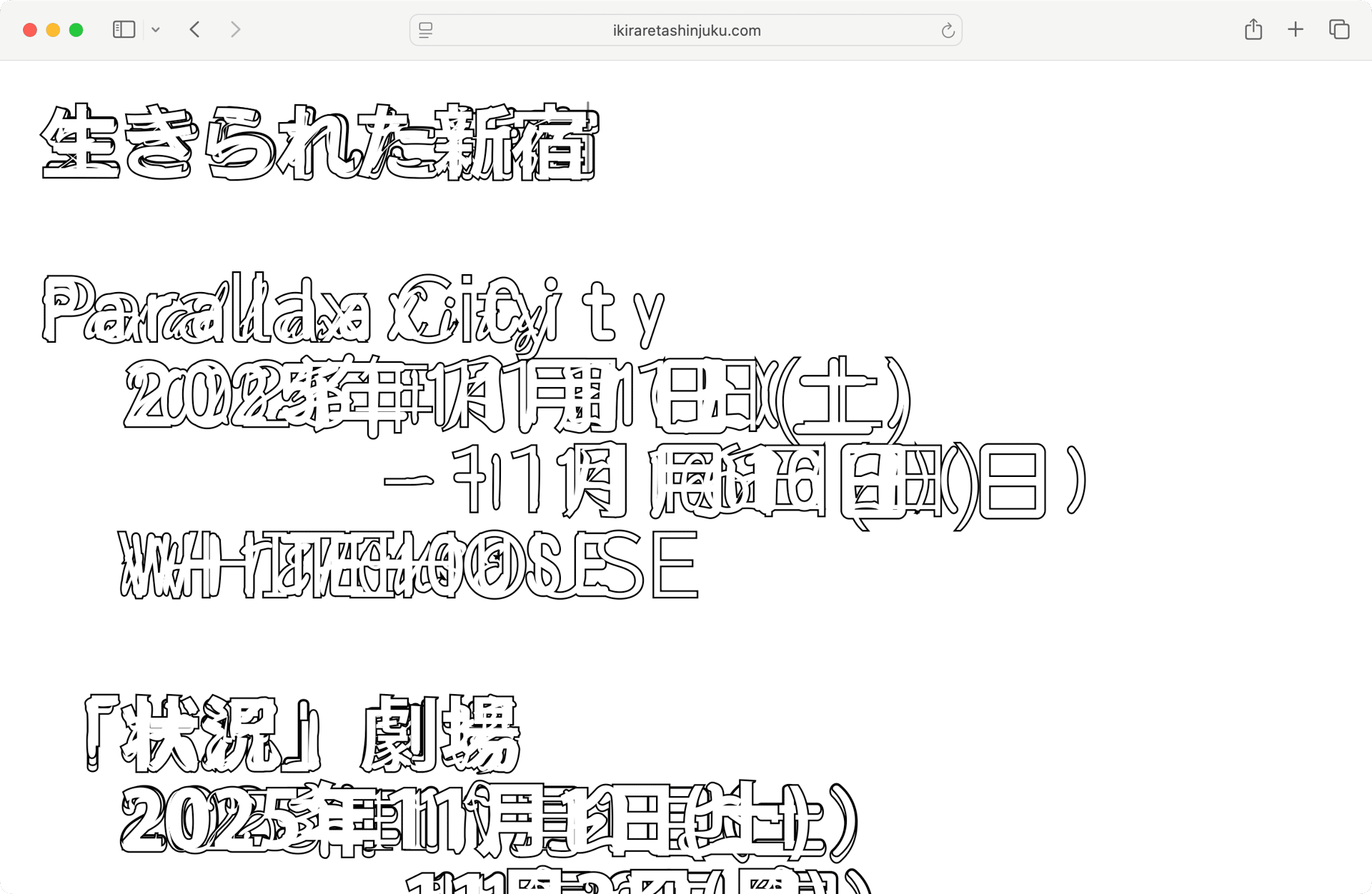 Motion design and engineering for Ikirareta Shinjuku(Lived Shinjuku) website, an urban research exhibition set in Shinjuku and held at various locations across the district starting in October 2025.Based on research into the ecosystem of fonts actually installed throughout Shinjuku—originally conducted and designed by art director and designer Shuto Otsuki—this project implements a system that dynamically and interactively generates typographic forms. By synthesizing multiple fonts according to a single underlying rule, the system produces evolving letterforms that reflect the lived visual landscape of the city.